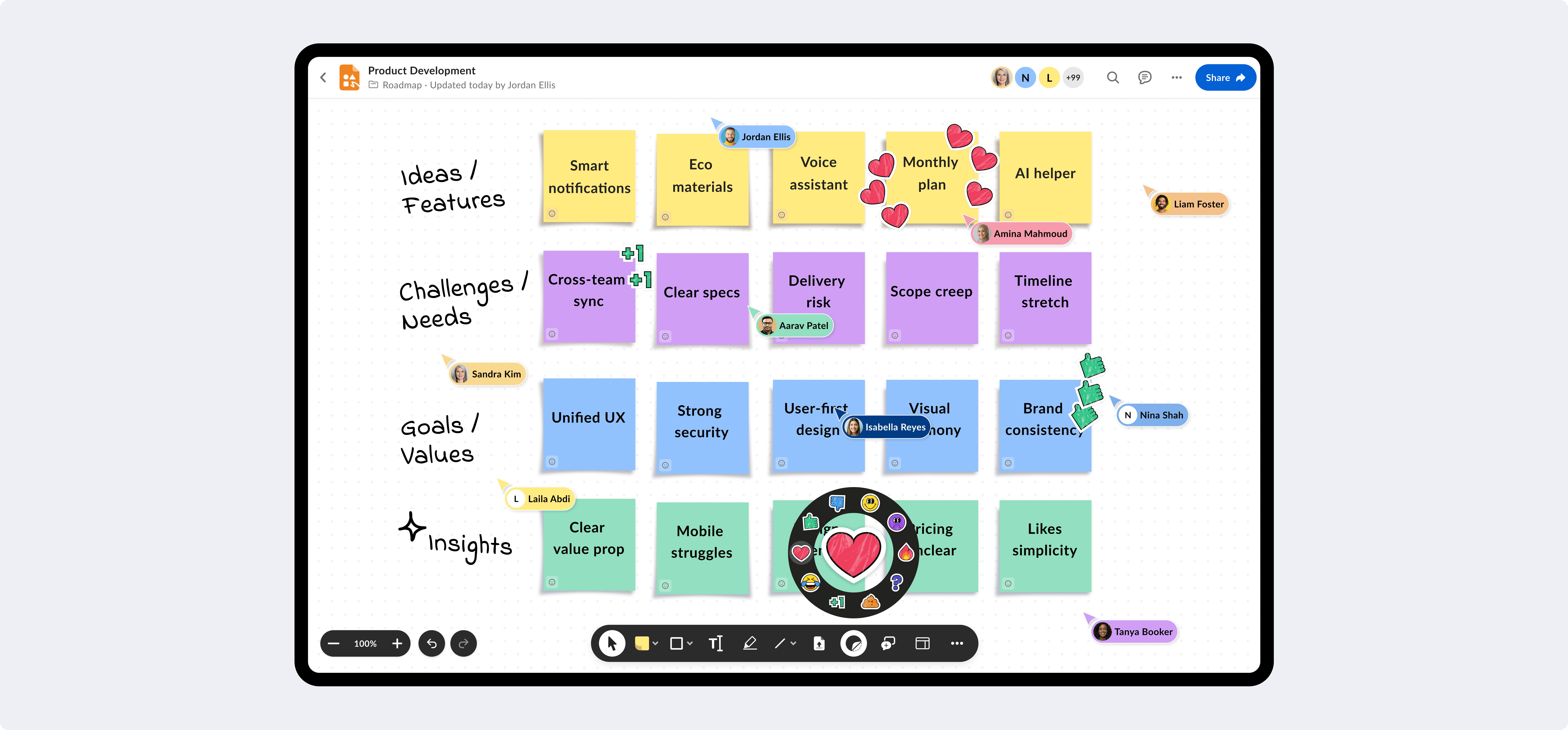I was one of the core designers on the product. I led the design of key features such as adding text to connectors, placing the first object on the board, collaborator management, enhancing toolbars for object editing, developing interactive stickers, testing various ideas and interaction mechanics, and ensuring the tool is accessible and compliant for all types of users.