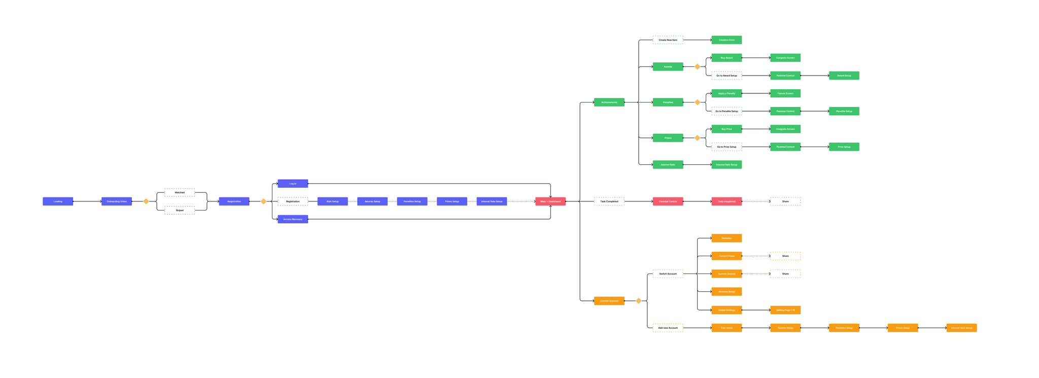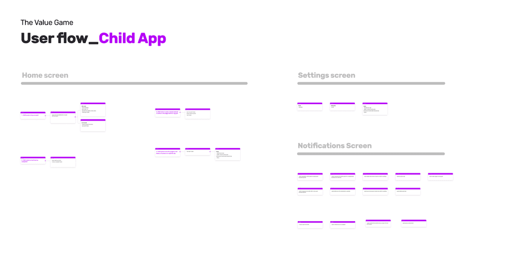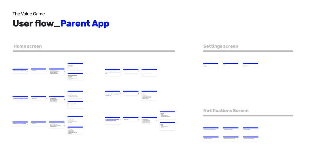 From there, I moved into user flows — mapping how each type of user (parent vs. child) would navigate through tasks, goals, rewards, and settings.