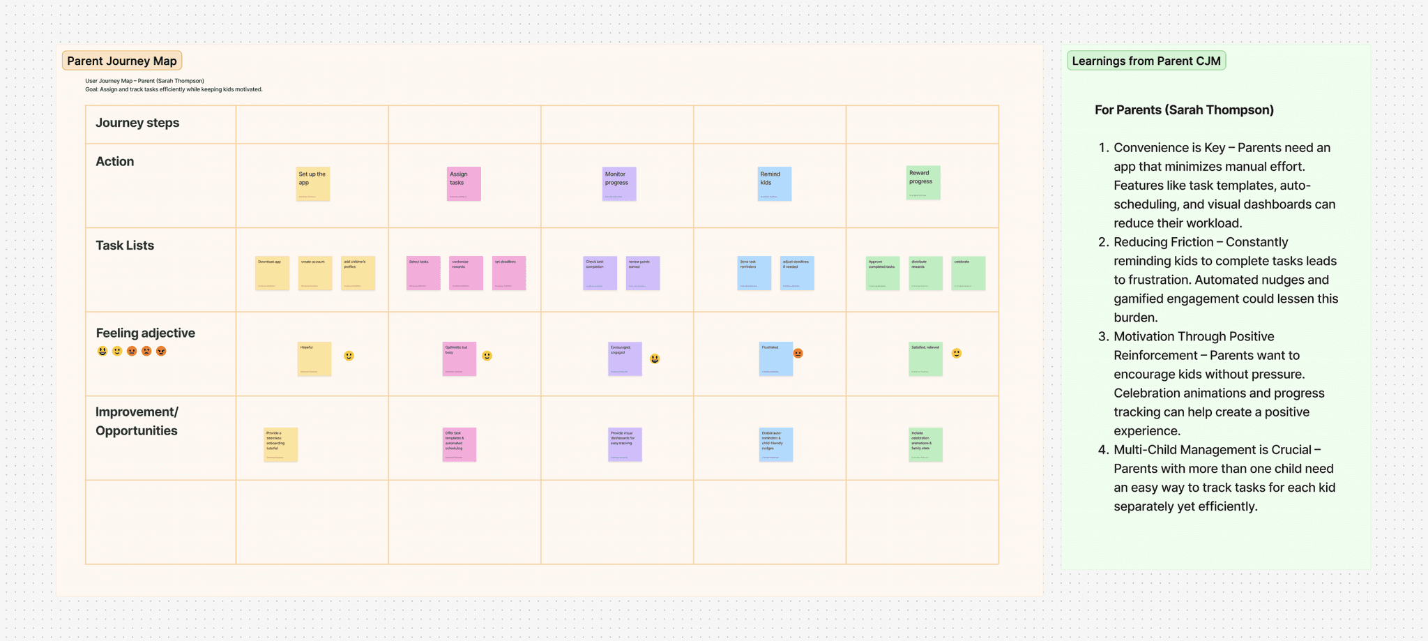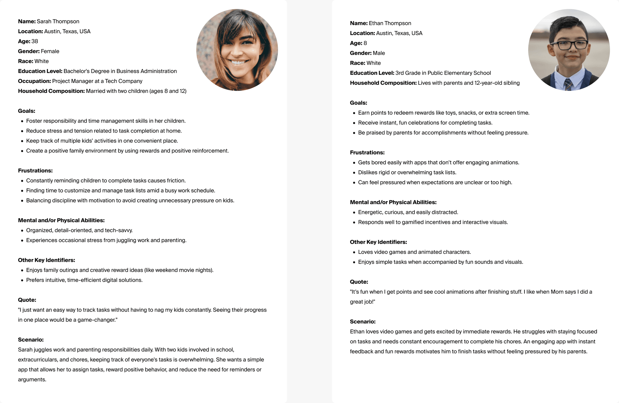 These personas guided every design decision — ensuring the app balances clarity and control for parents, with playful motivation and ownership for kids.