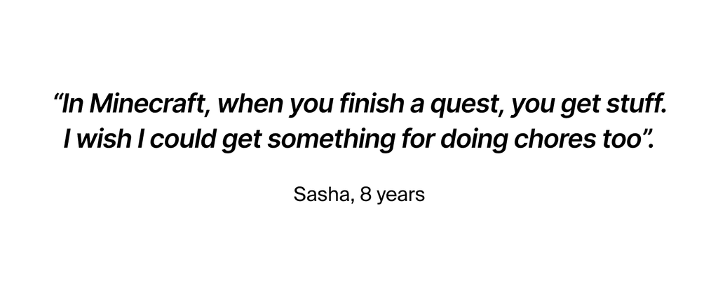In interviews, children frequently compared real-life tasks to games — “In Minecraft, when you finish a quest, you get stuff. I wish I could get something for doing chores too.” This revealed a powerful insight: children are already wired to respond to game-like mechanics — they’re used to completing quests, earning points, and unlocking rewards. By mirroring this logic in everyday tasks, we could shift responsibility from “boring obligation” to “fun challenge.”